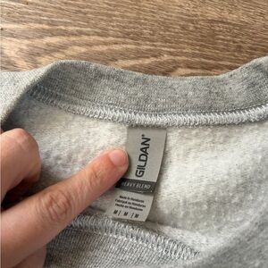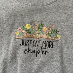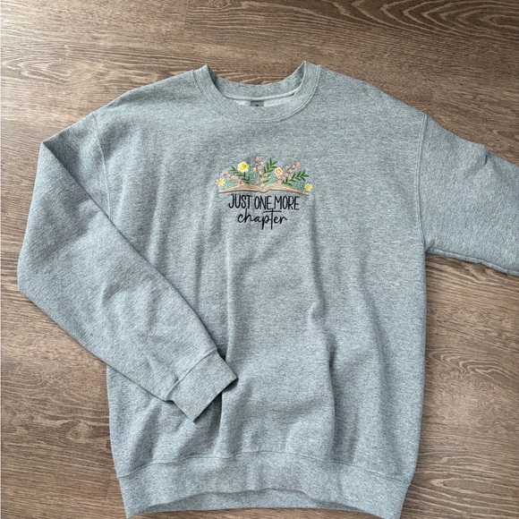 Comfortable gray crewneck sweater. Features a floral design with text. Ideal for casual wear.