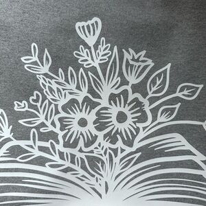 Cozy gray sweatshirt featuring a white floral book design. Perfect for casual wear.