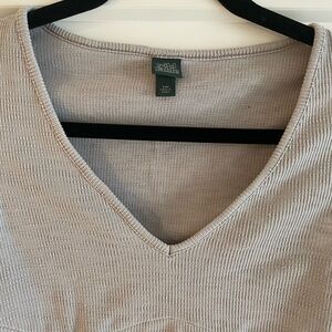 Elevate your style with this chic gray V-neck ribbed top. Perfect for any occasion, this top offers both comfort and elegance. Great condition, size small.