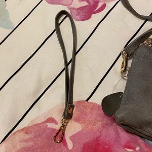 Absolutely adorable gray crossbody bag in like new condition. Has gold hardware, cute gold flower zipper pull, adjustable crossbody strap and 3 compartments with a hidden card holder. Also comes with a single strap to carry as a wristlet. This is the perfect bag for shopping or clubbing.