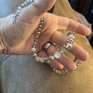 Featuring this sparkly gray crystal beaded wire wrap bracelet. It will fit most wrists with its wrap design. The bracelet is in excellent vintage condition and has gray& white beads with a silver tassel accent.