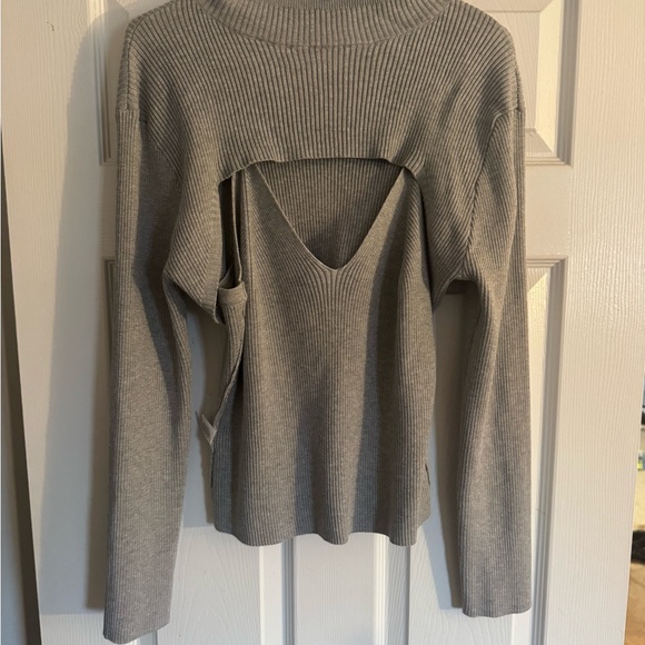 Stylish gray ribbed sweater with unique cutout design. Perfect for a chic look.