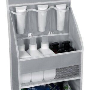 🧿【Large Capacity & Mesh Windows】 3 more PVC pockets than others, larger compartments sized 15’’ (W) x 5.5’’ (D) x 7.08’’-10.22’’ (H) , can hold high stuff up to 10.22 inch height, fitting any bottles/lotions of different sizes. The mesh window for ventilation keep items dry and see through