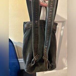 Selling this gray drawstring that I’ve had forever. I don’t remember the brand because it was a gift, but it’s a super cute and reliable backpack that’s still in good condition. I think the material is kind of like a suede with some leather on the straps and cover.