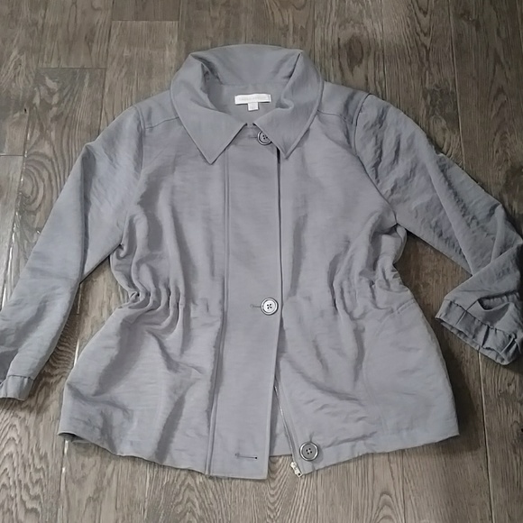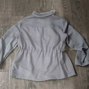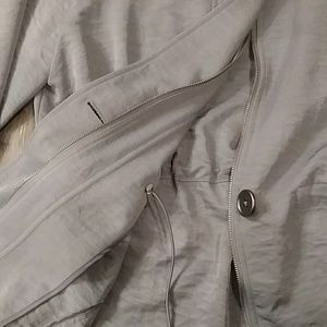Classy and figure flattering drawstring waist jacket with a bit of sheen. Large button or zipper entry. Side entry pockets. Worn and washed once, great condition.