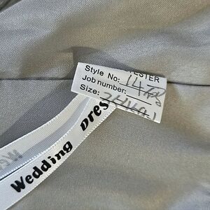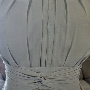 Beautiful dress!! Never worn. Bought as a bridesmaid dress, custom made Size 14. Fun flow and ruffle through the hem. Cross sash in the front with a long tie in the back. Clips and zipper are perfect with a high collar and a bralet sewn in.