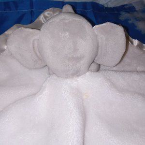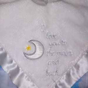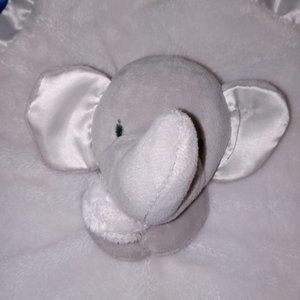 How cute is this?! Gray Elephant Rattle Lovey “I Love You to the Moon and Back” lovie blanket. With satin back and satin ears, this little elephant is holding his blankie. In excellent preowned condition. For baby and toddler boys and girls. Soft and cuddly! Made by Baby Starters and measures 14” square.
