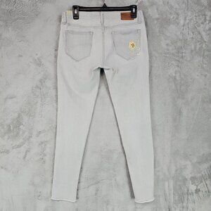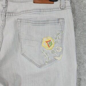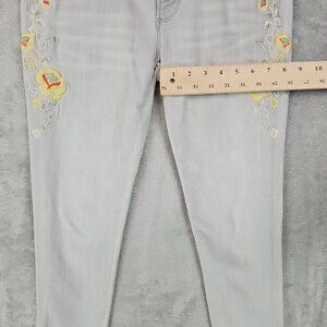 Stylish gray jeans with elegant yellow embroidery. Perfect for a chic and casual look.
