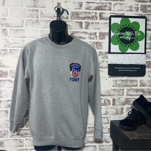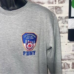 Gray sweatshirt featuring FDNY embroidery. Blue and red details.