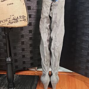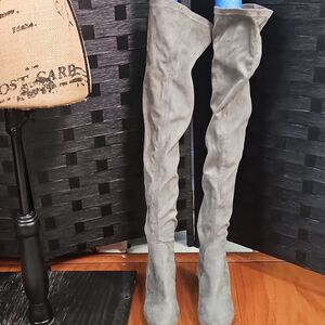 Step out in style with these chic gray faux suede wedge over the knee boots. Perfect for any occasion, these boots offer both comfort and elegance. Very good pre loved condition, please see pics of heel and top of boot with small hole, measurements in pics, smoke free home, ships next day. Over 2,500 Poshmark Sales. Bundle and Save!