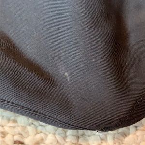 Logo buckle is scratched. I put that in the pics. Fabric is not pulled anywhere and stitching is still in tact but there are two very faint faded spots the size of a marker dot in crotch and an even smaller on on bottom of butt.