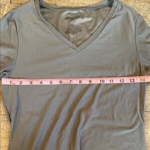 This gray long sleeve tee features a fitted design that offers a sleek and modern look. Crafted from a soft, lightweight fabric, it ensures comfort throughout the day. The V-neckline adds a touch of elegance to this versatile top, making it perfect for casual outings or relaxed gatherings.