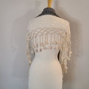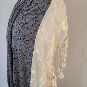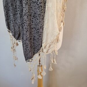 Gray Floral Lace & Crochet Scarf. This scarf is lightweight with little black and gray flowers on the fabric part and the bottom trim has lace embroidered with flowers and has hanging crocheted detailing. It’s in excellent preowned condition.