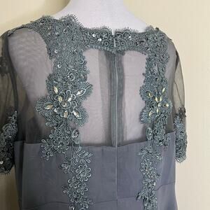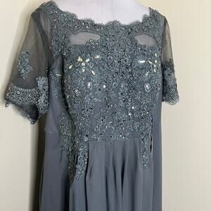 This stunning gray maxi gown features a scoop neckline and flutter sleeves, perfect for wedding guests. The fitted waist and flowing chiffon skirt create a graceful silhouette, while the embellished bodice adds a touch of sparkle.
