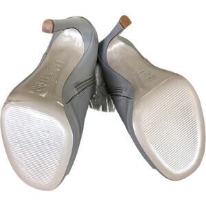 Italian designer leather fringe cuffed stiletto heal with open toe stiletto heel in smooth gray leather, fringe, solid color, zip, stiletto heel, leather lining, leather sole