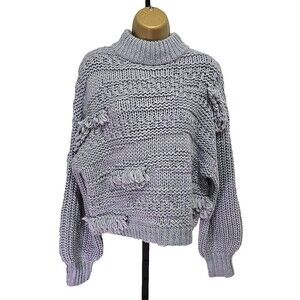 Gray Fringe Wool Blend Chunky Slouchy Cable Knit Sweater Womens Small Mock Neck
