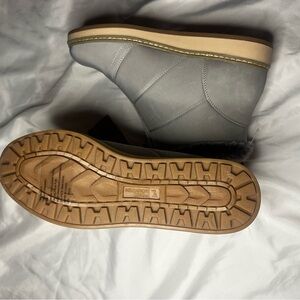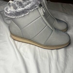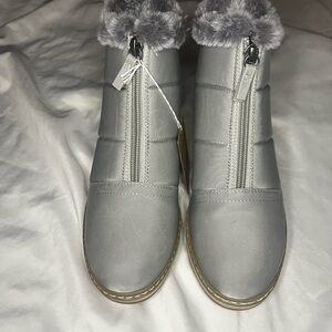 Stay cozy and stylish with these gray fur-lined women's boots. Perfect for chilly days.
