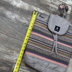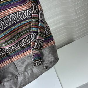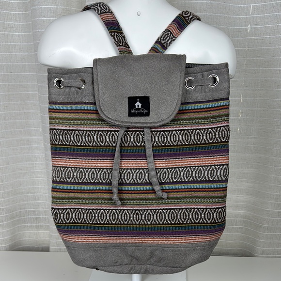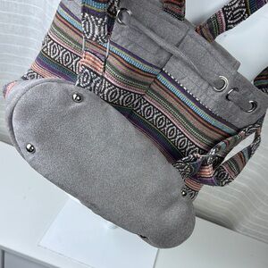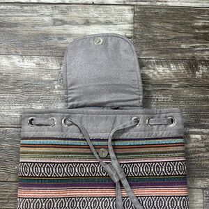 This stylish gray backpack features a unique geometric pattern, combining modern design with a bohemian flair. Crafted from durable canvas, it offers a practical drawstring closure and leather-like accents for a touch of elegance. Perfect for everyday use, this backpack seamlessly blends functionality with fashion.