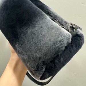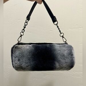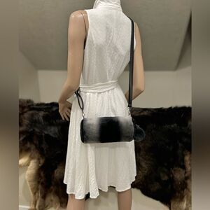 Brand new. This Stylish barrel bag is handmade from dyed genuine shearling leather, Includes double Rabbit fur balls bag charm. Spacious enough for your phone, wallet, cosmetics, sunglasses, compact umbrella, credit cards, keys & other items. Includes 2 straps, can be used as a wristlet, shoulder bag or cross body bag.