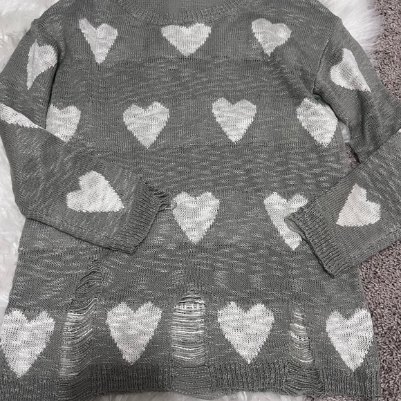 Cozy up in this stylish gray sweater featuring a charming heart pattern. Perfect for adding a touch of warmth and love to your wardrobe.