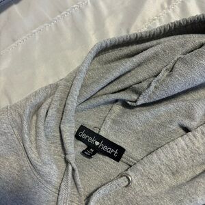 Stay cozy and stylish with this gray hooded sweater featuring a chic striped hem. Perfect for casual outings.