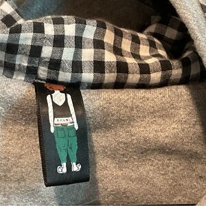 I have no clue what the brand is on this. Says something in an Asian language on the back of the tag but don’t know what it means. If you know, tell me! It’s very comfortable, I wore it a few times but it was too big. I’m usually a medium and dress size 6 so I would guess this is size large. Stylish gray hooded jacket with zip-up front. Features a checkered lining for added flair.