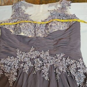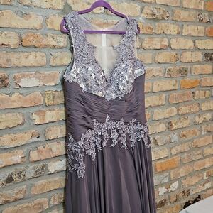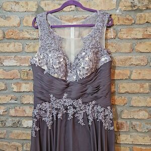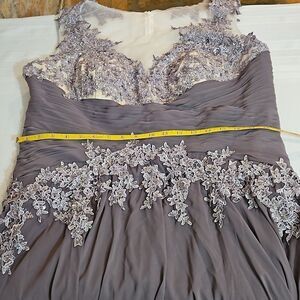 Gray Illusion sleeveless maxi gown, mermaid tail hem, applique bust, shoulders and waist, invisible back zipper,  fully lined, interior bra, size 18W. Excellent pre loved condition,  measurements in pics,  smoke free home,  ships next day.  Bundle and Save!