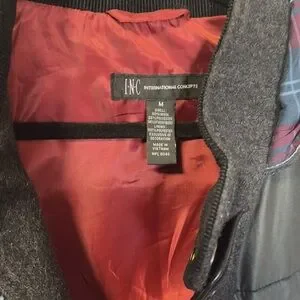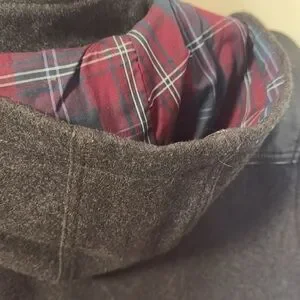 This is a men’s gray felt jacket. There are four pocket in the front and a hood lines with a checkered material. Zipper and buttons in the front.