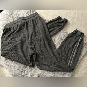 Comfortable gray jogger pants with a drawstring waist. Features side stripes for added style.