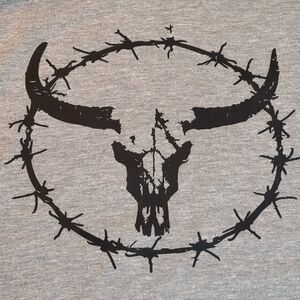 Showcases a bold and detailed bull skull design framed by barbed wire, offering a distinctive Western-inspired look.