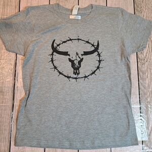 Gray Kids Short Sleeve Tee with Bull Skull and Barbwire Design