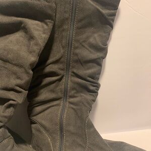 These gray knee high boots feature a slouchy design with a convenient side zipper for easy wear. Crafted from a soft, fabric-like material, they offer a stylish and comfortable fit. The slightly rounded toe and low heel make them perfect for everyday wear.