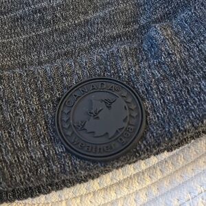 Stylish gray knit beanie featuring a logo patch. Perfect for casual wear. Excellent condition.