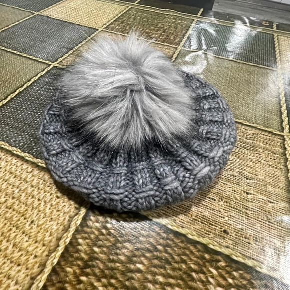 Stylish gray knit beret featuring a fluffy pom pom. Perfect for adding a chic touch to any outfit. New tag