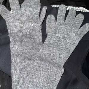 Stylish gray knit long elbow gloves featuring a charming bow detail. Perfect for adding elegance to your winter wardrobe.