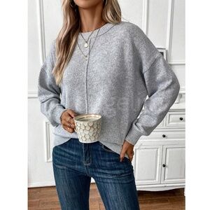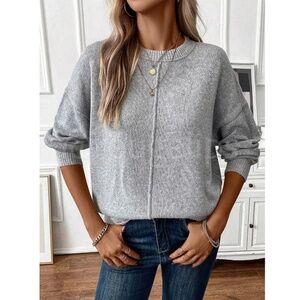 Gray Knit Pullover Loose Fit Sweater Long Sleeve Drop Shoulder