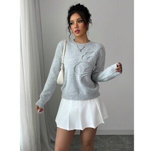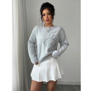 Gray Knit Pullover Sweater Textured Floral Appliqué