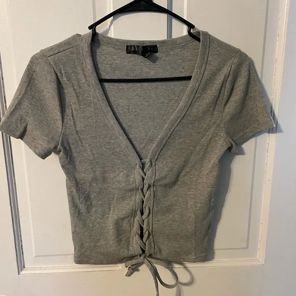 Stylish gray ribbed top with a trendy lace-up front. Perfect for casual outings.