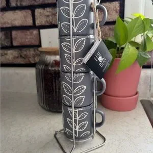 Enhance your kitchen with this elegant set of gray stackable mugs featuring a charming leaf pattern. Perfect for coffee or tea, these mugs add a touch of style to your home.