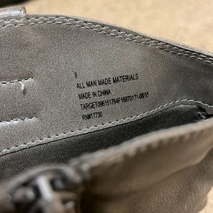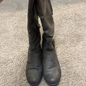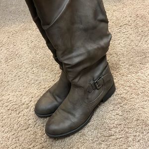 Gray zip up boots. 3/4” heel and about 16” tall.
