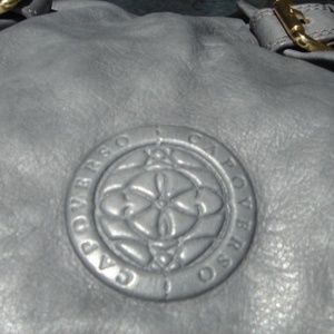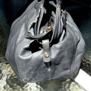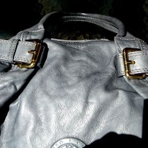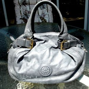 Beautiful gray leather handbag with top zipper, logo and 2 buckles on the front.