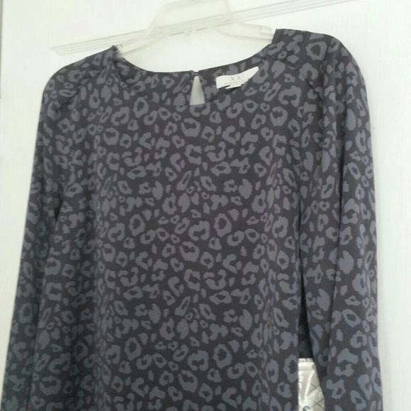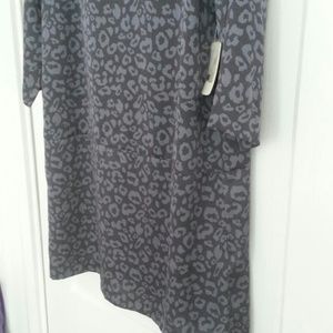 Three quarters sleeves, light gray leopard spots. Dress comes to mid thigh. Never worn.