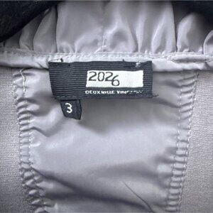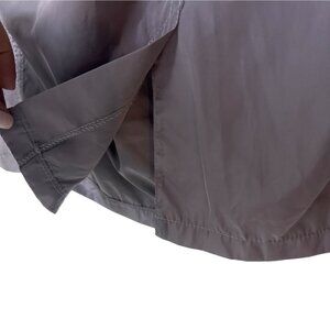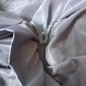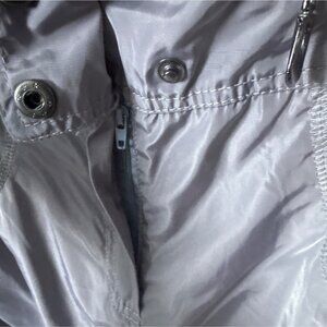 This gray hooded dress offers a sleek design with functional zipper accents and ruffle detailing, combining practicality and style for versatile wear.