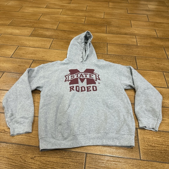 Comfortable gray hoodie with State Rodeo logo. Perfect for casual wear. Has paint stain on front and sleeve