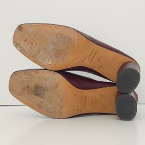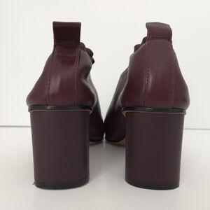 Super soft burgundy Italian leather. Ballet elastic and tab back. Matte plastic block high heel.