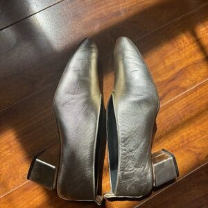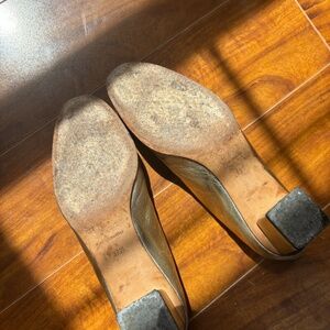 Lovely Gray Matters Mildred gold pump with a comfortable cube-shaped block heel and glove-like leather. Wear on the heel, soles, and toe box as pictured.