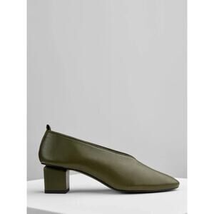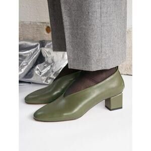 olive green, minimalist, Italian leather, modern chic, block heel, city style, workwear, casual elegant, office shoes, timeless