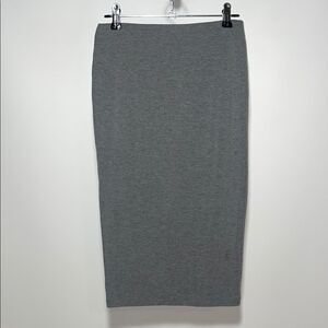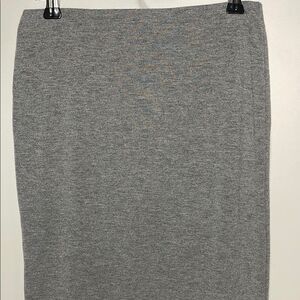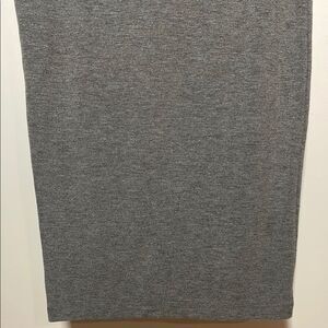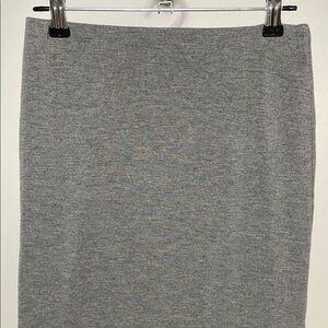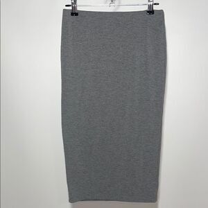 This gray midi pencil skirt features a sleek, form-fitting silhouette that extends below the knee, making it ideal for professional settings. Crafted from a subtle textured knit, it offers a minimalist design perfect for a polished look. Its versatile style transitions seamlessly from the office to cocktail events.