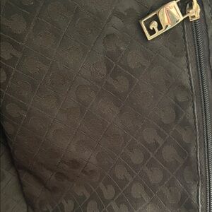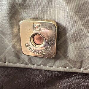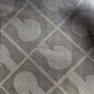 Stylish gray tote bag with monogram pattern. Perfect for everyday use.