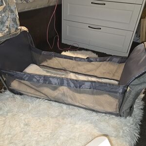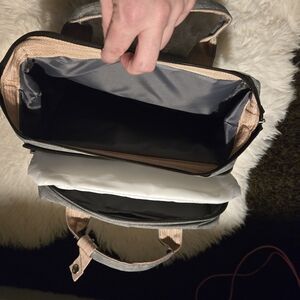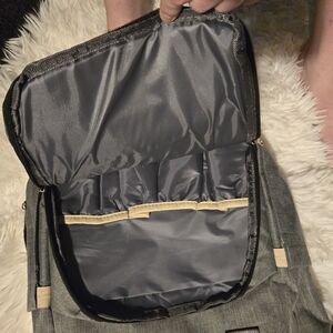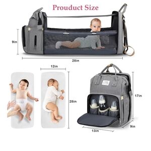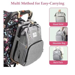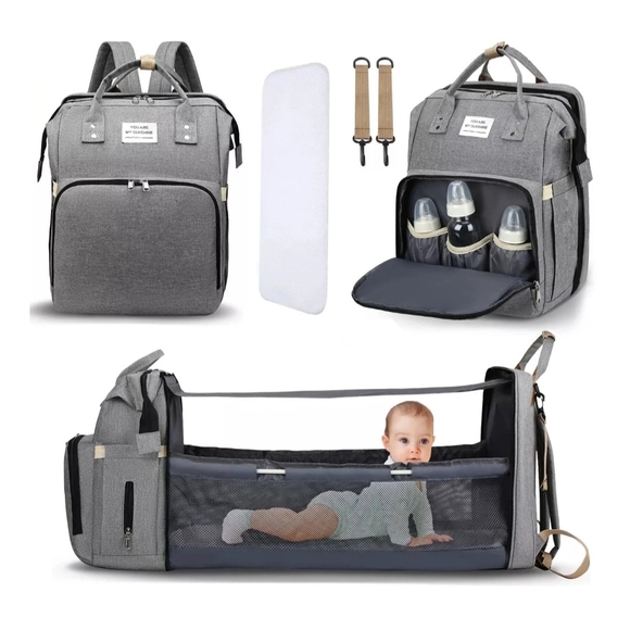 This versatile gray backpack is perfect for modern parents on the go. It features multiple compartments for packing everything you need for the day. Ideal for travel or daily use, expandable diaper changer, with stabilizing rods that fold away for easy storage.